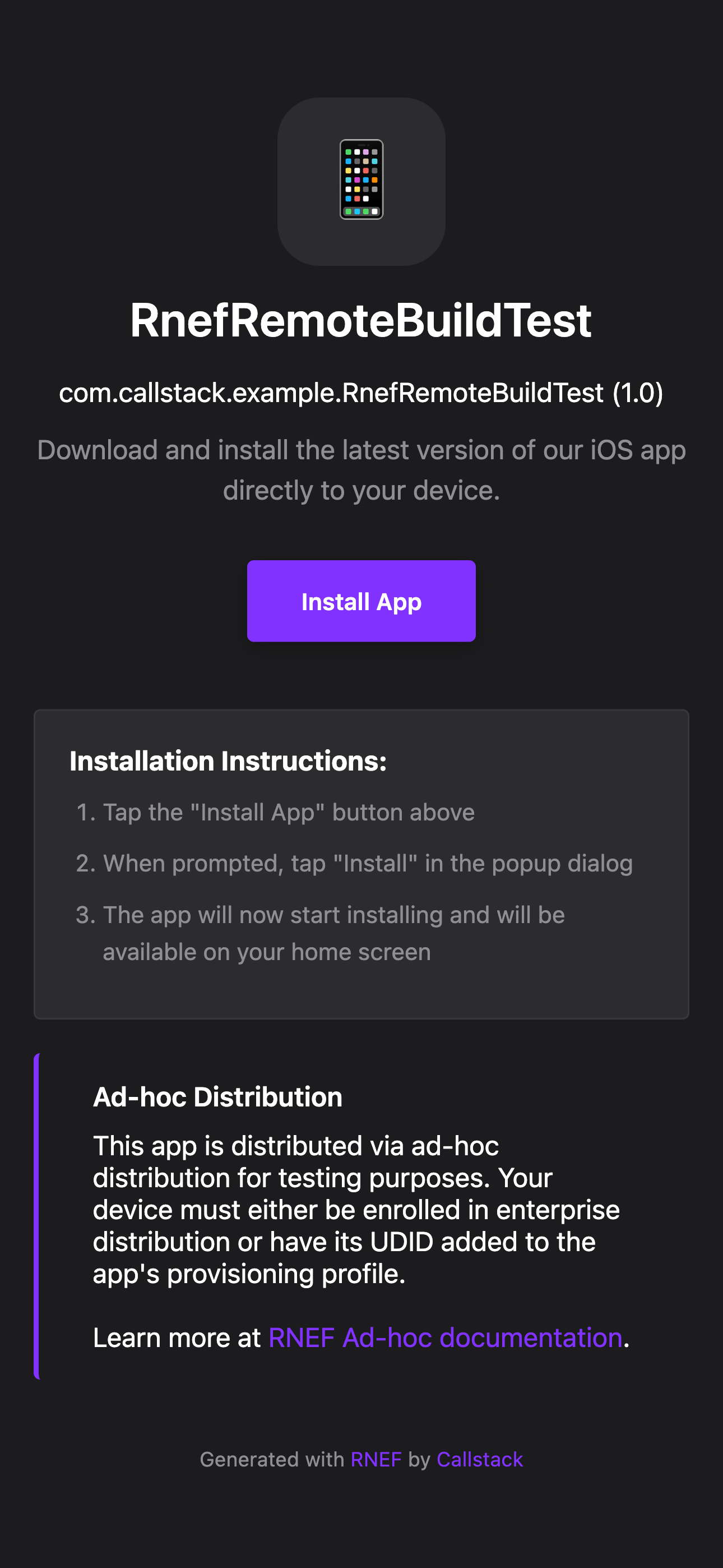 <directory>/ad-hoc/<artifactName>/<AppName>.ipa, an index.html landing page, and a manifest.plist file<directory>/ad-hoc/<artifactName>/<AppName>.apk and an index.html landing pageThis index.html file will display an ad-hoc distribution web portal, allowing developers and testers to install apps on their devices by simply clicking "Install App" (iOS) or "Download APK" (Android).